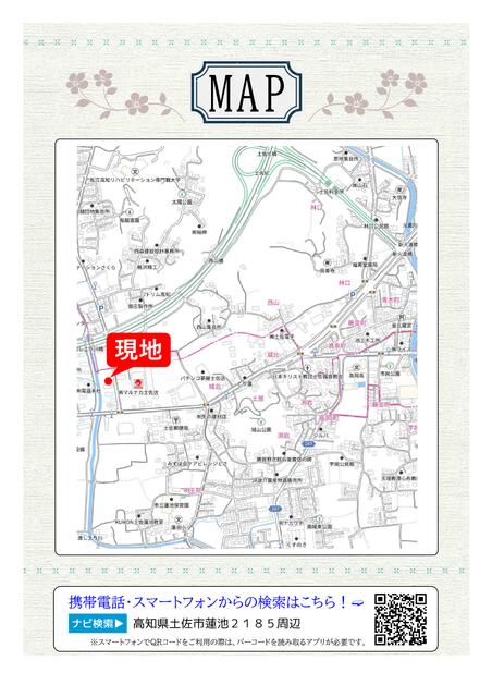 ※地図上の「対象地」は「〒781-1105 高知県土佐市蓮池」の場所を指しています。実際の場所ではない場合がございます。詳しくはお問い合わせください。